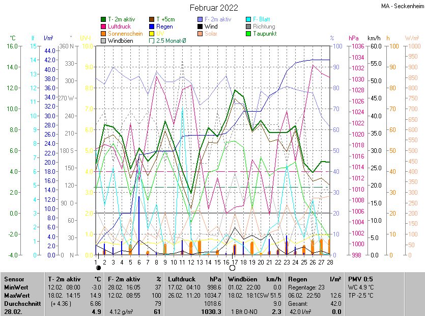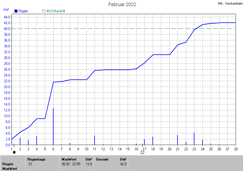 Die Durchschnittstemperatur für den Monat Februar 2022 lag bei 6.84°C. Die Abweichung vom langjährigen Mittel war +4.34°C.