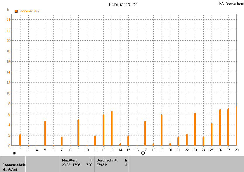 Dargestellt wird die grafische Übersicht für die Sonnenscheinzeit. Zu sehen sind immer die täglichen Sonnenstunden (von 0-24 Uhr):