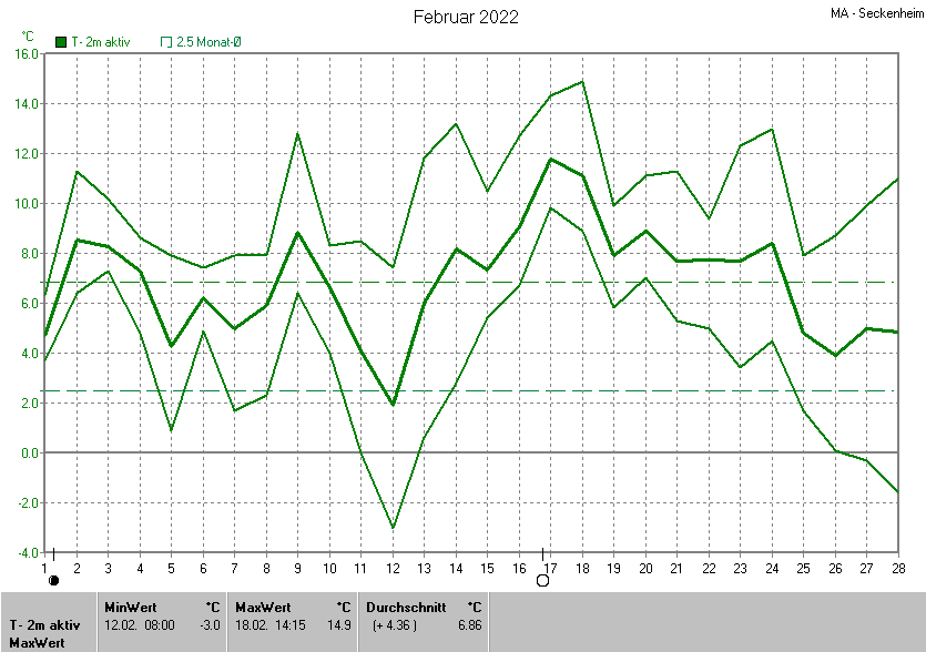 Der wärmste Tag war der 18.02.2022 um 14:15 mit 14.9°C. Am kältesten war es mit -3.0°C am 12.02.2022 um 08:00.