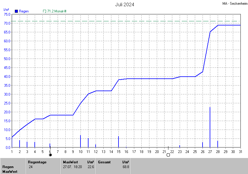 Die gesamte Regenmenge lag bei 68.8l/m² (entspricht: 96.6%) und war damit um -2.4l/m² vom langjährigen Wert entfernt. Niederschlag gab es an 14Tagen. Mehr als 2mm Regen gab es an 11Tagen. Sehr viel Regen mit mehr als 20mm pro Tag gab es an 1Tagen.