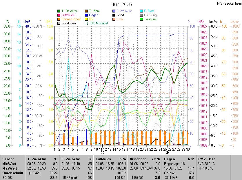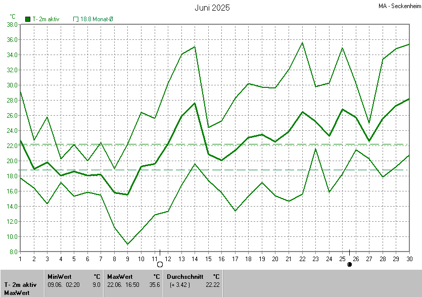Der wärmste Tag war der 22.06.2025 um 16:50 mit 35.6°C. Am kältesten war es mit 9.0°C am 09.06.2025 um 02:20.
