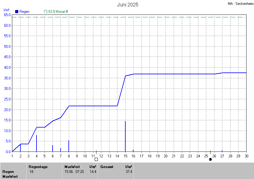 Die gesamte Regenmenge lag bei 37.4l/m² (entspricht: 58.6%) und war damit um -26.4l/m² vom langjährigen Wert entfernt. Niederschlag gab es an 10Tagen. Mehr als 2mm Regen gab es an 5Tagen. Sehr viel Regen mit mehr als 20mm pro Tag gab es an 0Tagen.
