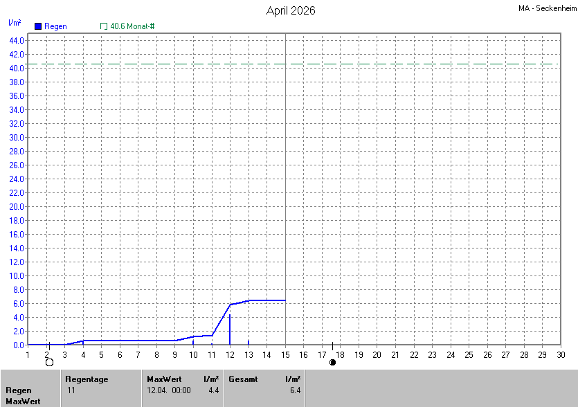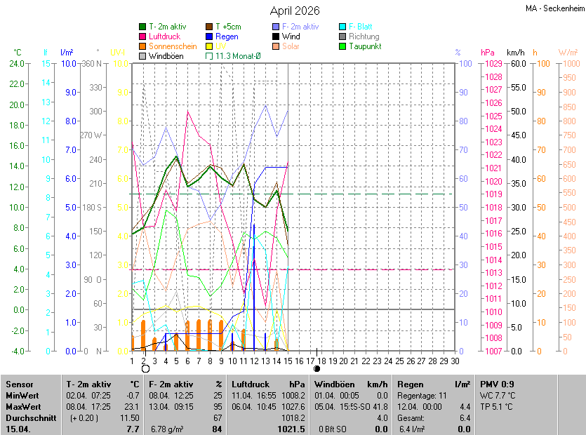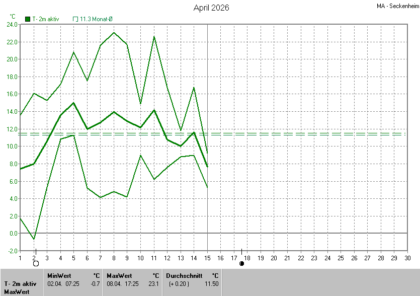 Die Durchschnittstemperatur für den Monat April 2026 lag bei 11.50°C. Die Abweichung vom langjährigen Mittel war +0.20°C.