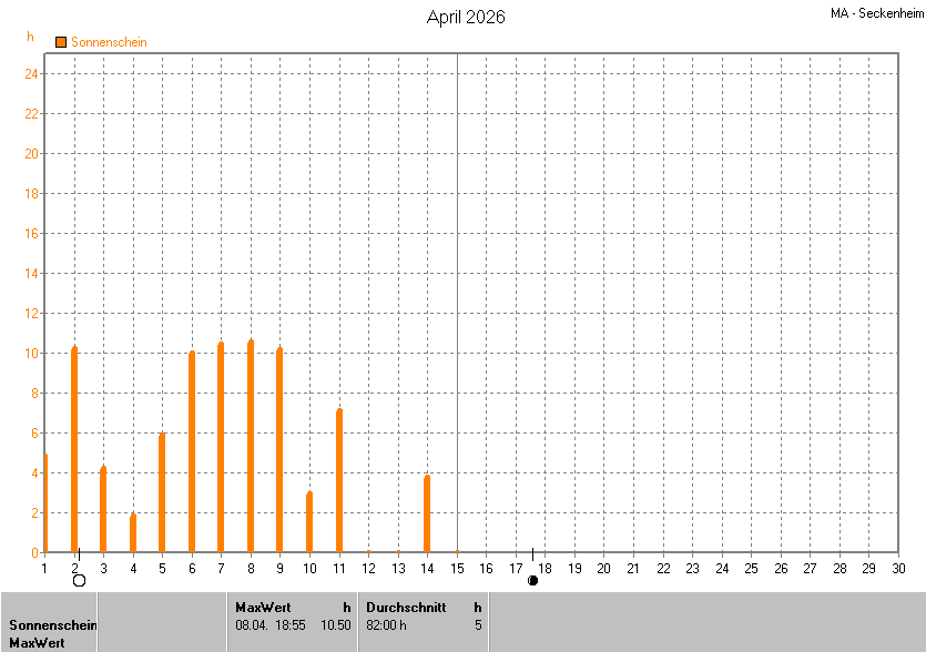 Dargestellt wird die grafische Übersicht für die Sonnenscheinzeit. Zu sehen sind immer die täglichen Sonnenstunden (von 0-24 Uhr):