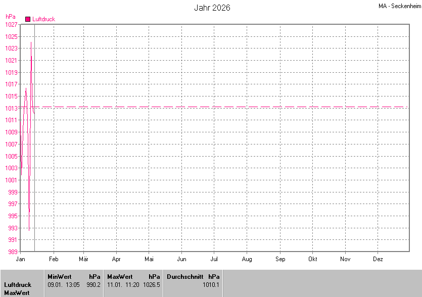 Die Durchschnittstemperatur für das Jahr 2026 lag bei 0.81°C. Die Abweichung vom langjährigen Mittel war -10.39°C.