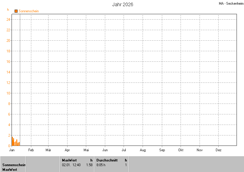 Dargestellt wird die grafische Übersicht für die Sonnenscheinzeit. Zu sehen sind immer die täglichen Zeiten (von 0-24 Uhr):