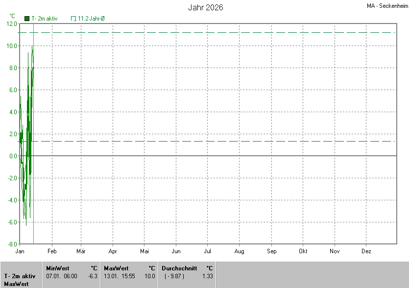 Am wärmsten war es am 13.01.2026 um 15:55 mit 10.0°C. Am kältesten mit -6.3°C am 07.01.2026 um 06:00.